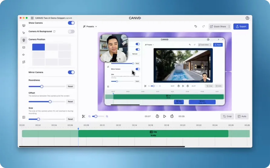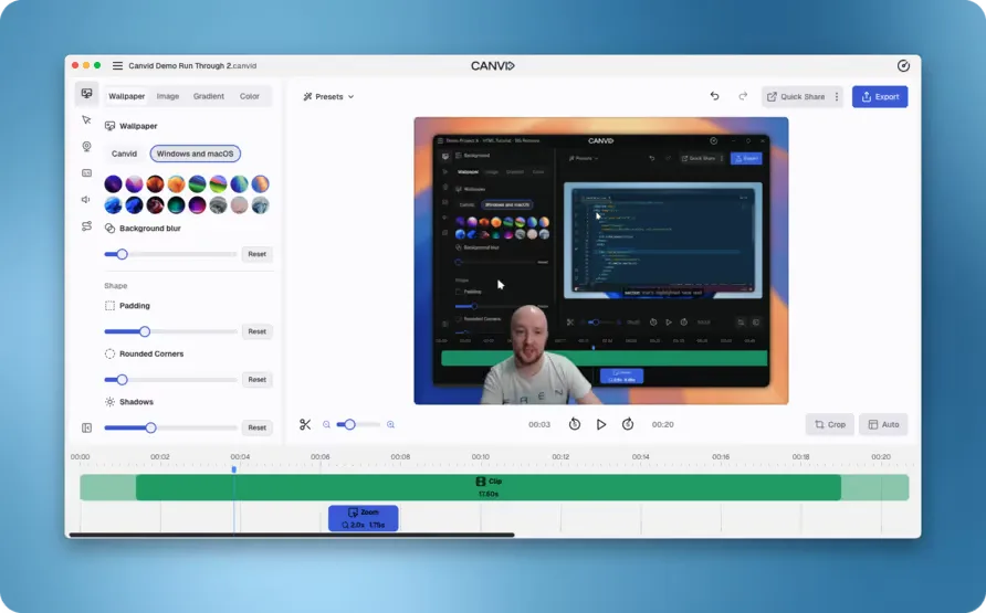- Superior Webcam Customization & Visual Polish: CANVID offers superior webcam control (size, shape, position) with custom/blur backgrounds, quality AI removal, and post-production styling (padding, gradients), ensuring a far more professional look than Loom’s presets.