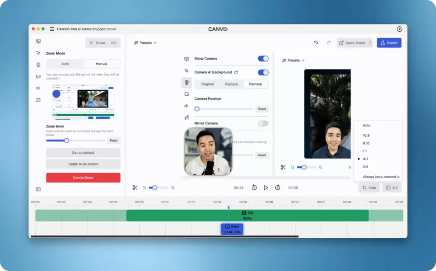 - Advanced Recording Control & Output Quality: Achieve precise framing with CANVID's window resizing (to aspect ratios, pre/post-recording) and dynamic zooms. Crisp 4K exports avoid the 'blank' look of basic recordings.